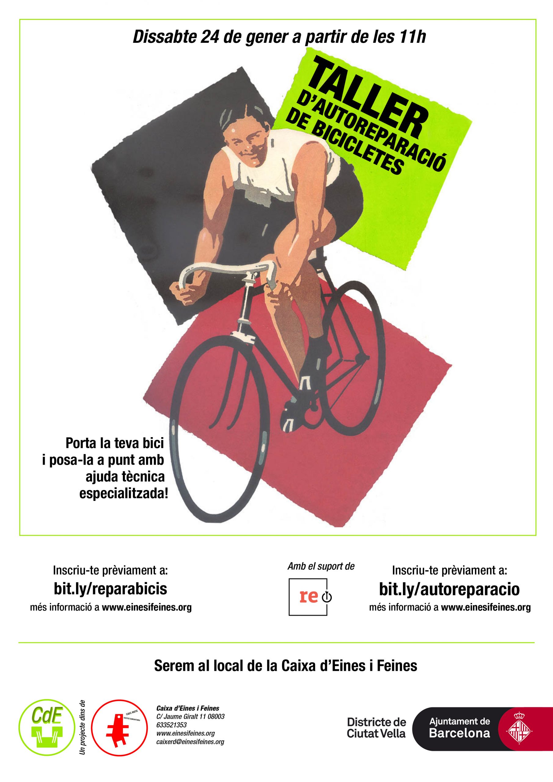 Una setmana després, el dissabte 24 de gener reprenem el taller d’autoreparació de bicicletes: podràs posar la teva a punt amb ajuda de la nostra mecànica especialitzada. Inscripcions: bit.ly/reparabicis.